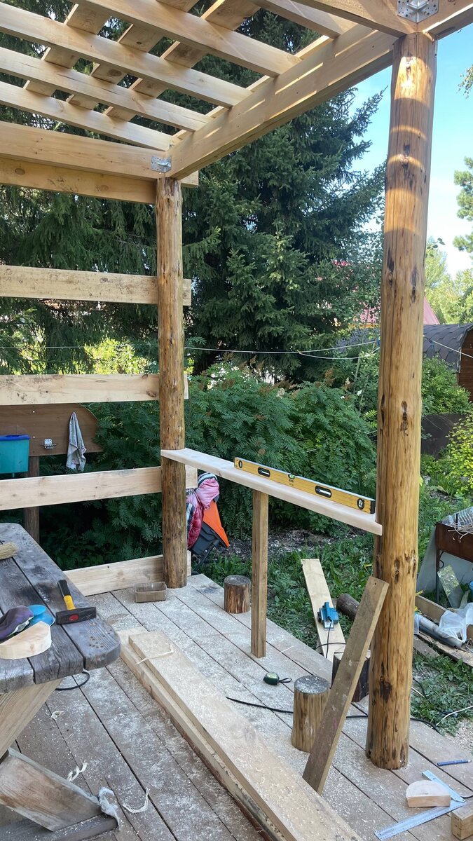 Ну что, прогресс есть? На сегодня сделал стропила и обрешетку. Так же подготовил стенку к сплошной зашивке. Начал готовить и врезать перила/ограждения. Доска сырая(( позже как высохнет, зашлифую и покрою чем нибудь. В ближайшие дни куплю ондулин и покрою крышу. #нашаТерраса #21сотка
