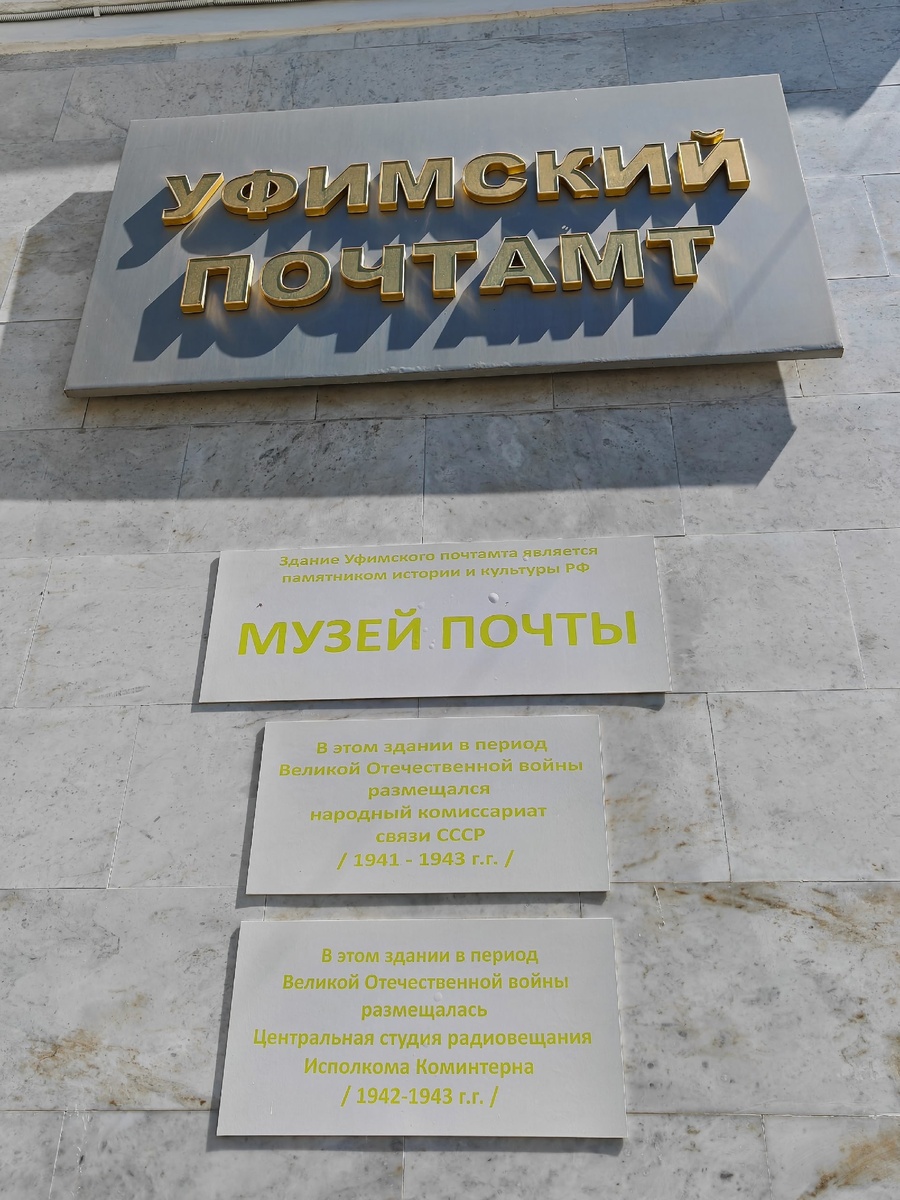 Музей почты Республики Башкортостан расположен в здании Уфимского почтамта и работает с 2010 года. А у входа в почтамт прямо на тротуаре красуется отметка нулевого километра - место, откуда начинается отсчёт километража всех башкирских дорог. Посетив залы музея, можно узнать, как зарождалась и развивалась регулярная почта на территории современной Башкирии. В настоящее время в музее представлено почти две тысячи экспонатов, в том числе оригинальные вещи, используемые почтовыми работниками XVIII–XIX веков. Рядом с музеем находится действующее почтовое отделение — самое крупное в Башкирии. Ежегодно Музей почты принимает участие в международной акции «Ночь музеев». Помимо специальных программ, которые сотрудники готовят к этому событию, все посетители могут в этот день отправить прямо оттуда открытку со специальным почтовым штемпелем «Ночь музеев». Отправить открытку из музея можно и в любой другой день, поставив на нее оттиск почтового штемпеля «Музей почты». Больше об Уфе читайте зд