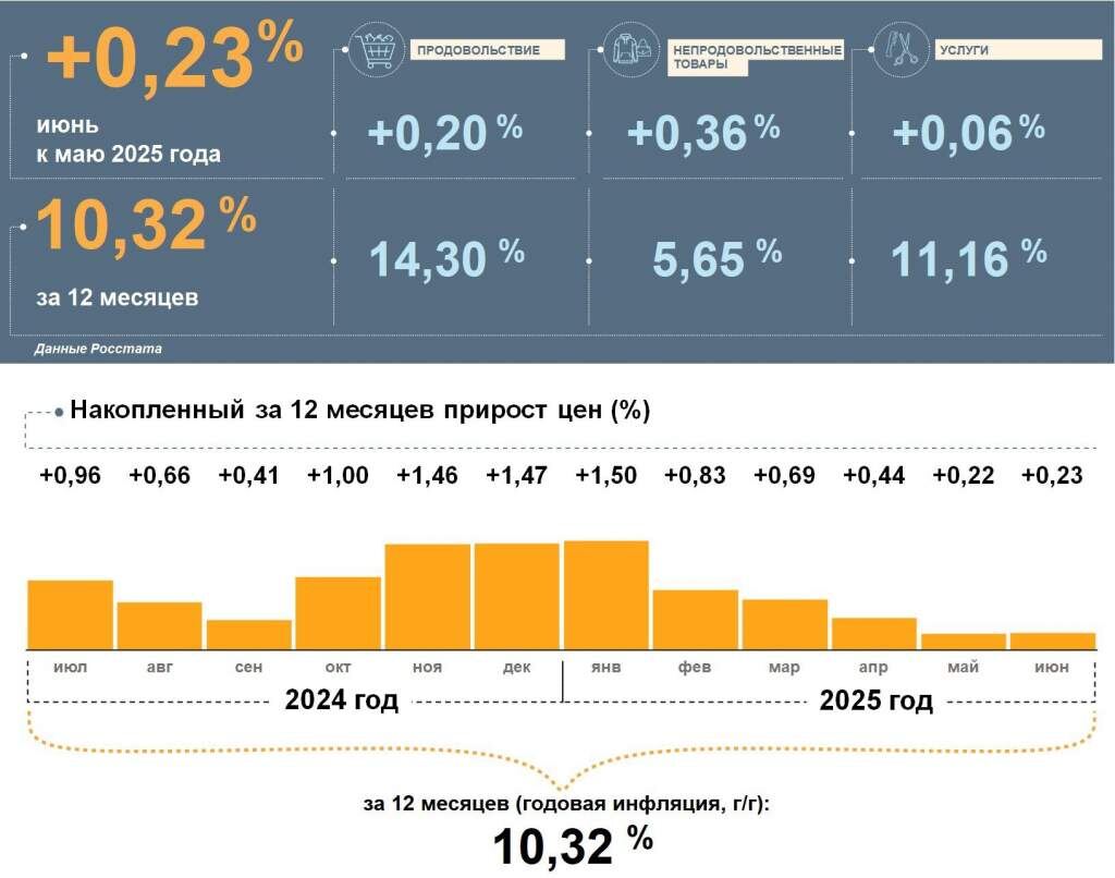 В июне 2025 года годовая инфляция в Курской области достигла 10,32%. Индекс потребительских цен по сравнению с маем вырос на 0,2%. С начала года этот показатель составляет 4,0%. На продовольственные товары: в июне выросли на 0,2%, а с начала года — на 5,7%. Наиболее заметно подорожали чай, кофе и какао. На непродовольственные товары: рост в июне составил 0,4%, а с начала года — 1,8%. Цены и тарифы на услуги: в июне увеличились на 0,1%, с начала года — на 4,5%.