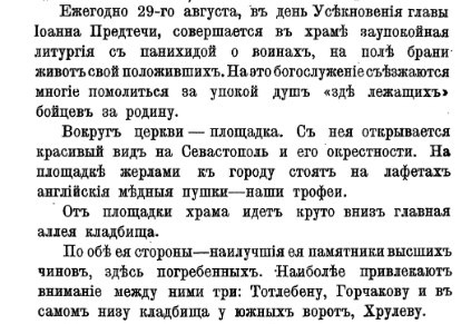 «Историческій путеводитель по Севастополю». При приближеніи къ Севастополю пароходомъ, еще издали виднѣется къ сѣверу отъ города четыреугольникъ зелени, рѣзко выдѣляющійся отъ безжизненной сосѣдней мѣстности. Надъ четыреугольникомъ этимъ высится сѣрая пирамида съ крестомъ въ ея вершинѣ. По мѣрѣ приближенія, можно разсмотрѣть, что между зеленью бѣлѣютъ памятники и кресты. Это Братское кладбище на Сѣверной сторонѣ Севастополя и храмъ надъ нимъ. Тѣла убитыхъ и умершихъ отъ ранъ во время его обороны перевозились сюда черезъ бухту нагруженными въ баржахъ и предавались землѣ сначала на Михайловскомъ кладбищѣ, потомъ восточнѣе его на западномъ скатѣ Куриной балки, гдѣ нынѣ находятся остатки кремальерной линіи, и окончательно на южномъ скатѣ верховья Куриной балки. Это послѣднее кладбище и носитъ названіе собственно «Братскаго». Названіе это дано по предложенію Тотлебена. Названіе самое подходящее народному духу, такъ какъ покойники погребались въ огромныхъ могилахъ. Ряды ихъ «братски» помѣ