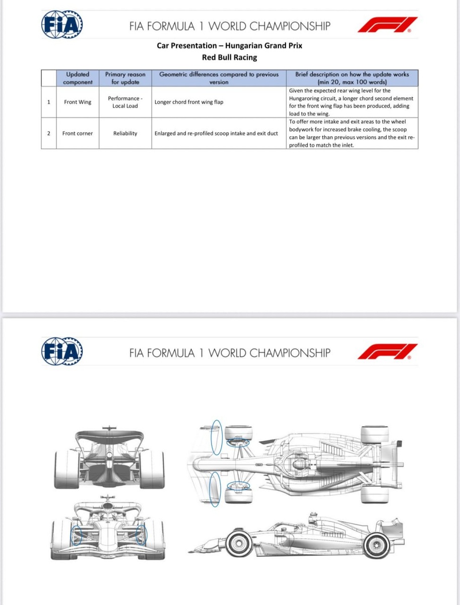 Обновления команд на Гран-при Венгрии: Ред Булл привезли переднее крыло с увеличенным вторым закрылком(1-2 фото) для баланса с задним крылом, настроенным на максимальный прижим(3 фото). Ведь Венгрию не спроста называют «Монако без стен», так как здесь команды выбирают аэродинамическую конфигурацию между Барселоной(4 фото) и Монако(5 фото). Помимо закрылка, РБ обновили и воздуховоды передних тормозов. Астон Мартин привезли новый, более агрессивный закрылок на переднее крыло, которое представили на предыдущем Гран-при.(6 фото) Рейсинг Буллс обновили воздуховоды передних тормозов, а также добавили жабры на кожухе двигателя.(7 фото)