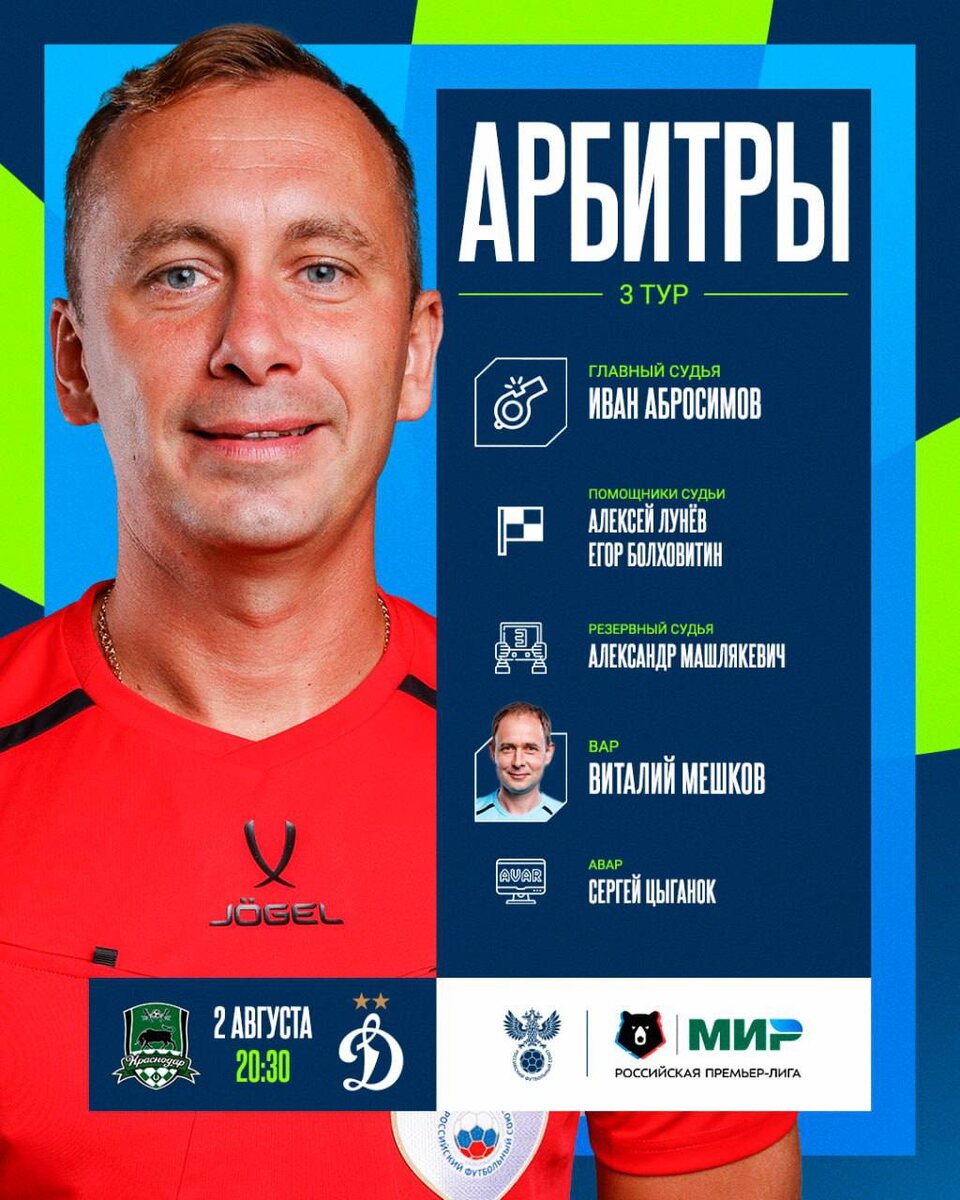 Иван Абросимов назначен главным арбитром матча 3 тура Мир РПЛ #краснодарДинамо Судья на VAR — Виталий Мешков. Иван до этого два раза судил матчи с участием нашей команды. В кубке против Махачкалы и против Оренбурга в чемпионате. Довольно странный выбор на такой матч. Но хотя пару раз нас топил «лучший судья страны», поэтому не так страшно. Матч покажут по бесплатному каналу Матч ТВ. Комментатор – лишь один Моссаковский. Встреча начнется в 20:30. ⚽️ Подписывайтесь на БуДсу