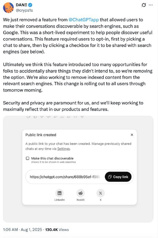 Чаты с ChatGPT больше не будут попадать в Google 🎉!