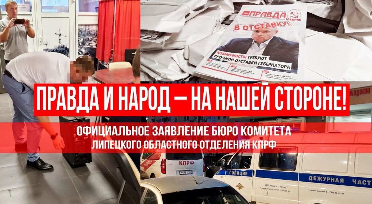Вечером 31 июля в Липецкий обком КПРФ нагрянули сотрудники ЦПЭ УМВД России по Липецкой области. Цель визита – обследование помещений и транспорта КПРФ. Обследование помещений, а фактически обыски с изъятием, начали с кабинета первого секретаря Липецкого обкома КПРФ Н.В. Разворотнева, забрав его телефон. Без комментариев и объяснений силовики изъяли макеты агитационных листовок кандидатов КПРФ, которые ещё в процессе разработки и не оплачены из специального счёта. Изъяты также носители информации (жёсткие диски, SD-карты), монтажный компьютер и ноутбук главного редактора газеты «Ленинское знамя» и депутата Липецкого облсовета А.В. Старцевой и даже АПМ прошлых лет. Главной «добычей» силовиков стал тематический тираж информационного бюллетеня «Правда», в котором Липецкие коммунисты обосновывают требования отставки губернатора Игоря Артамонова, информируют о программе Победы и Народном референдуме КПРФ. Изъят весь нераспространенный тираж – около 70 тыс. экз. Оперативные мероприятия