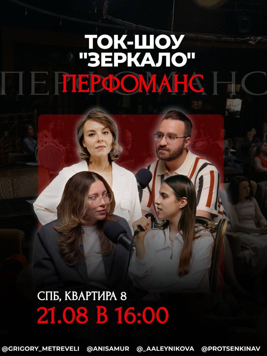 Ток-шоу Зеркало 21 августа в СПб Ведущие шоу: ✨ Виктори Проценкина и Ангелина Алейникова Приглашенные эксперты: ✨психологи Метревели Григорий и Анна Рязанова Обсудим, тему внутреннего критика, отношения с собой, поработаем с мозгом, восприятием себя и мира Но это ещё не всё: ✔️ Перформанс-спектакль — через творчество отразим то, что тревожит внутри. ✔️ Открытый диалог с приглашенными спикерами ✔️ Возможность рассказать свою историю (анонимно или открыто) 📍Квартира 8, ул. Марата, 1/71 🗓21.08 (чт) в 16:00 🎟 Купить билет ПО ССЫЛКЕ или в канале шоу @mirrortalkshow