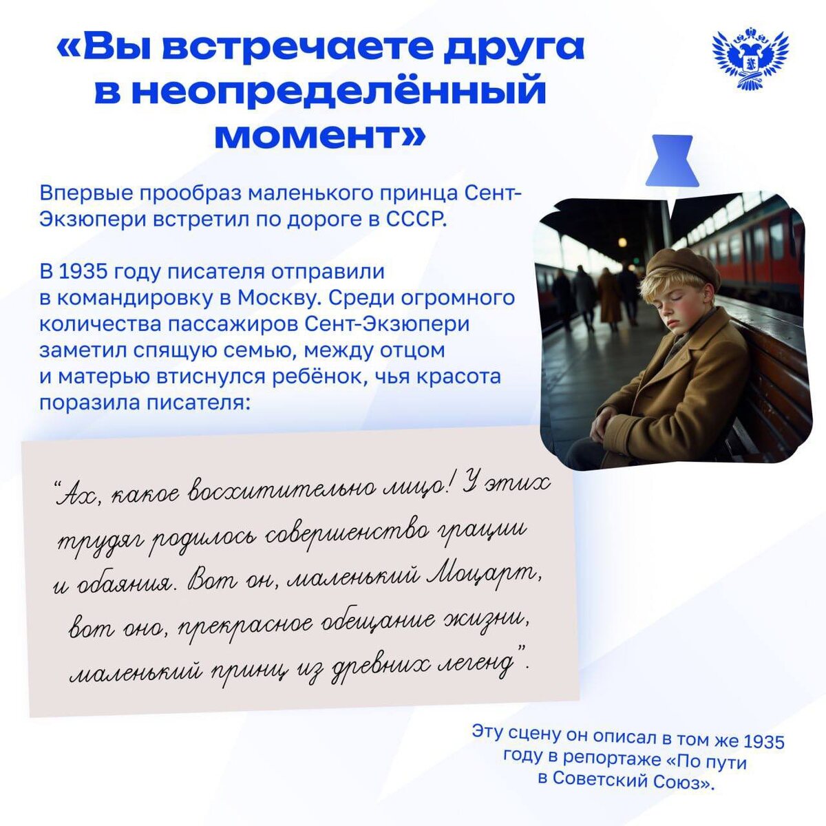 «Все взрослые сначала были детьми, только мало кто из них об этом помнит» (Антуан де Сент-Экзюпери) «Артек» — это Страна детства, где каждый чувствует себя ребёнком вне зависимости от возраста Всероссийская акция «Книга другу» в любимом детском центре обрела международный статус: в рамках 8-й смены ребята более чем из 35 стран передали книги представителям Народного фронта, которые отвезут их в Донецкую и Луганскую народные республики, Херсонскую и Запорожскую области Участники Международного фестиваля «Наш дом — Земля» подготовили подарки для «Артека» Они передали в библиотеку центра по одному экземпляру повести-сказки Антуана де Сент-Экзюпери «Маленький принц», написанной на их родном языке — китайском, монгольском, узбекском, турецком, французском, английском, португальском, суахили, белорусском и др. «Наши замечательные гости из разных стран мира подарили «Артеку» книжку «Маленький принц» на разных языках Это очень здорово, когда дети, разговаривая вроде бы на разных языках, г