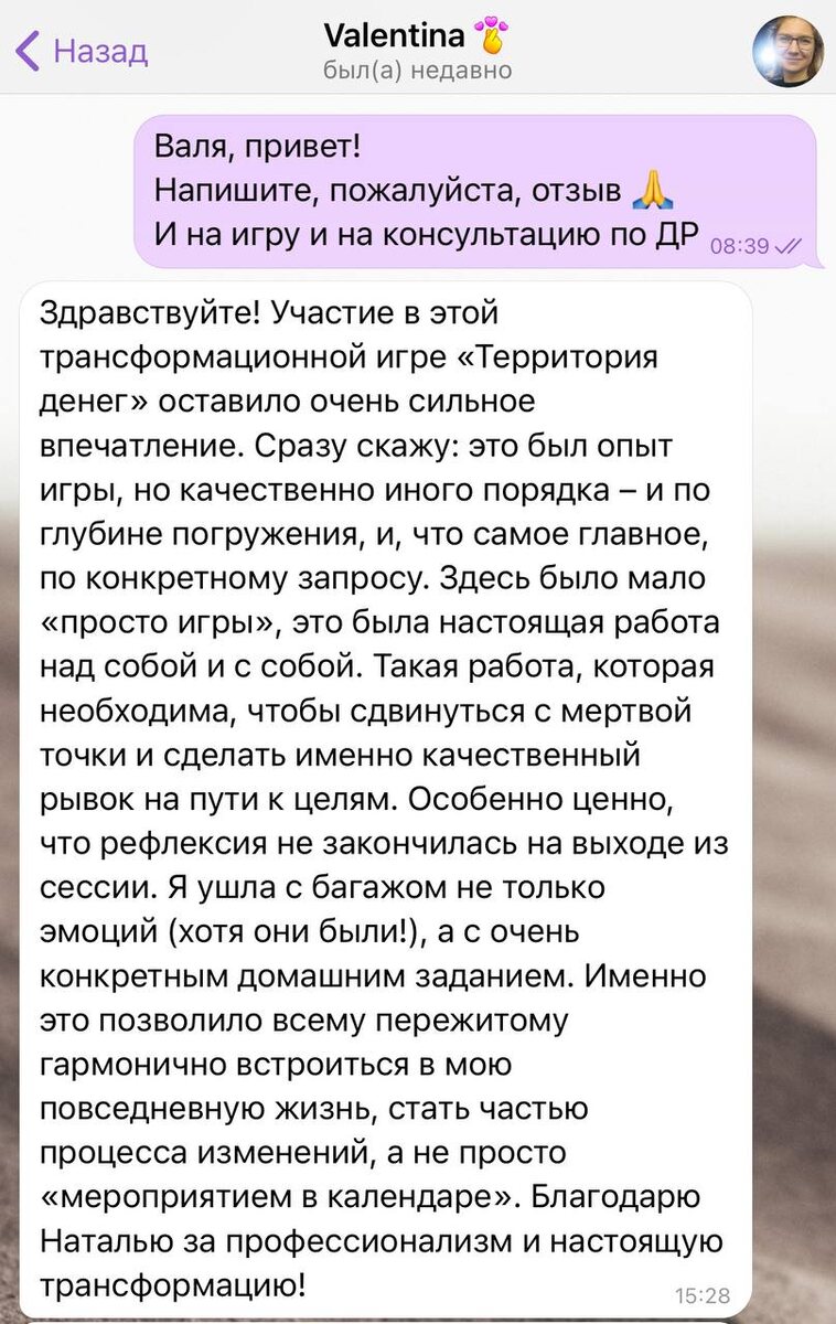 💌 О том, как важны ваши слова Друзья, для меня по-настоящему ценна ваша честная, живая обратная связь — после консультации по дате рождения, участия в трансформационных играх, после любого общения, где мы касаемся глубин, смысла и энергии жизни. Когда вы делитесь тем, что почувствовали, с чем ушли, что запустилось в вашей реальности — я читаю это сердцем. Иногда слёзы, иногда мурашки. Но всегда — благодарность. Потому что трансформации становятся реальными через ваши глаза и опыт ✨ На прошлых выходных прошла камерная, очень глубокая игра «Территория денег». У нас было всего две участницы — и это создало невероятно тёплую атмосферу. Познакомилась с Валентиной — и вот её отзыв. Пусть он станет откликом тем, кто чувствует зов, но пока сомневается 💫 📎 Мои услуги. Обнимаю. И спасибо каждому, кто идёт со мной в этот путь 💛 #территорияденег #отзывы #нумерологиявжизни #играпомощник #кодуспеха
