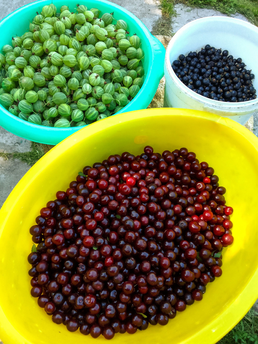 01.08.2025 Девочки, привет! Первое августа, как так то!?) Июнь помню, а июль то как так быстро пролетел.. У нас сегодня ягодно-фруктовый день! С утра солнышко и настроение замечательное и желание сделать всё и сразу) Председатель вот только не в форме сегодня. Спина заболела, ой говорит, что-то я сегодня как старая бабка, всё болит(74 года) и похохатывает. Вот так говорю в город ездить, город это зло 🤣, я всё время после него болею, день надо отлёживаться, чтобы в себя придти. Позавтракали, я пошла лук последний убрала и ягодами занялась. Господи, откуда они берутся! Вишня мелкая была, после дождей так хорошо ягоды налились, на самом верху. Лазила вверх-вниз собирала, вишня у нас высокая. Смотрю Мамулик уже в смородине сидит, собирает, литра полтора ещё её собрала. Крыжовника зеленого литров пять собрала и ещё много его.. Я думала заканчиваются ягоды, а они всё спеют и спеют😂 Никто не покупает, в чате деревенском уже за копейки их продают, варианты приготовления в придачу предла