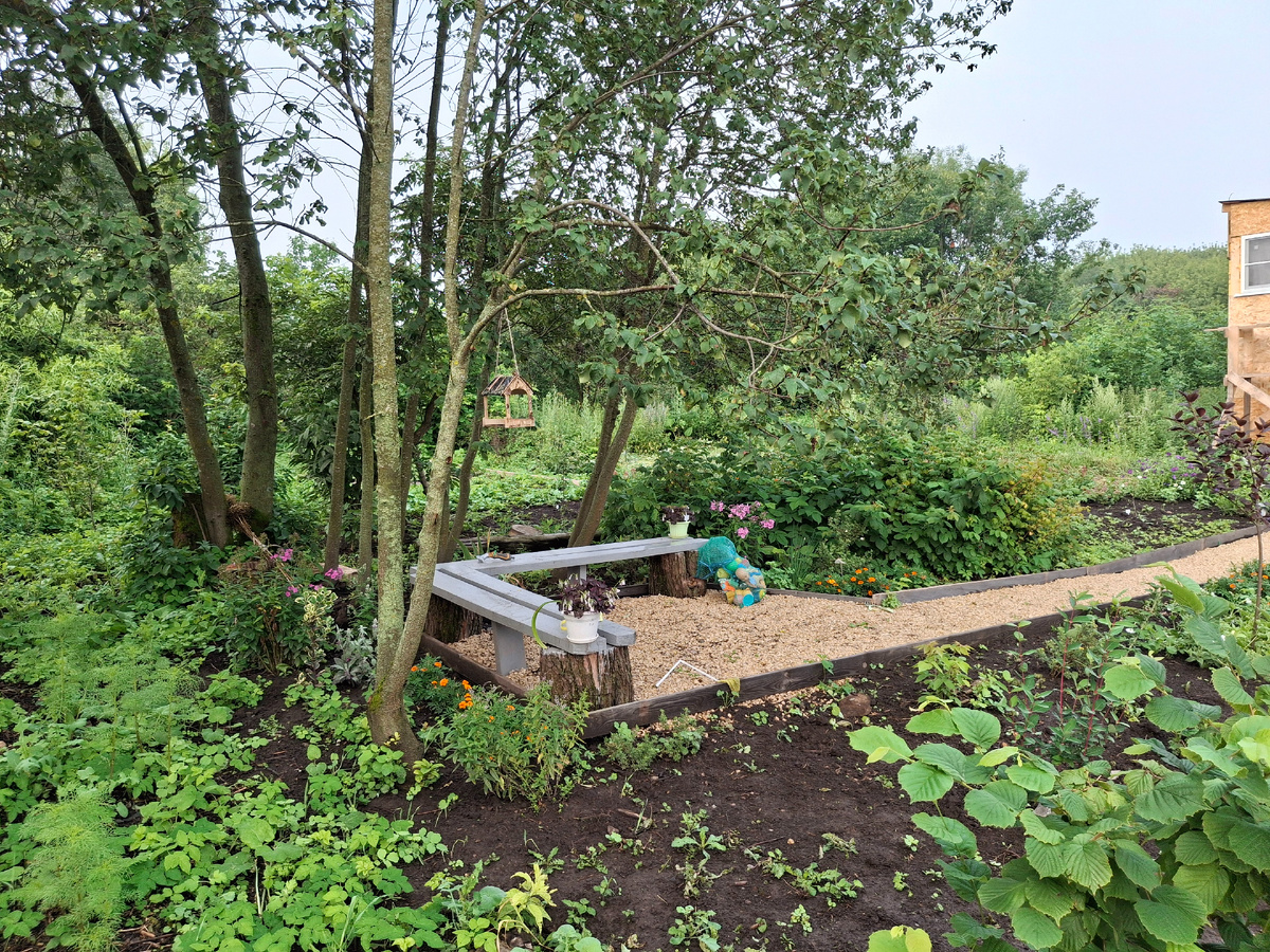 На этой части парка высажена еще одна липа. А под старым деревом черемухи мы решили поставить лавку для дневного отдыха в тени. Лавка есть а клумбы нет? Не порядок! Вот вам и клумба.