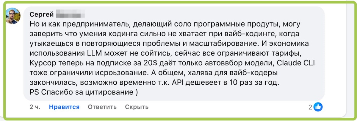 Гениально :) Вначале программистов подсаживают на приманку вайб-кодинга, а потом урезают лимиты и вводят тарифы. А люди привыкли программировать через ИИ и платят :) Все ведь хотят вайбить-кодить, когда не надо долго изучать мат.часть а можно сразу сделать проект и зарабатывать бабульки ... Русский ИТ бизнес