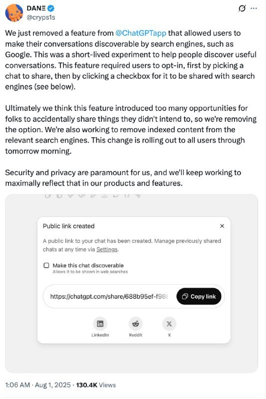 Ваши разговоры с ChatGPT больше не станут частью поиска Google! 😌 OpenAI прислушалась к волнению пользователей и отключила эту функцию