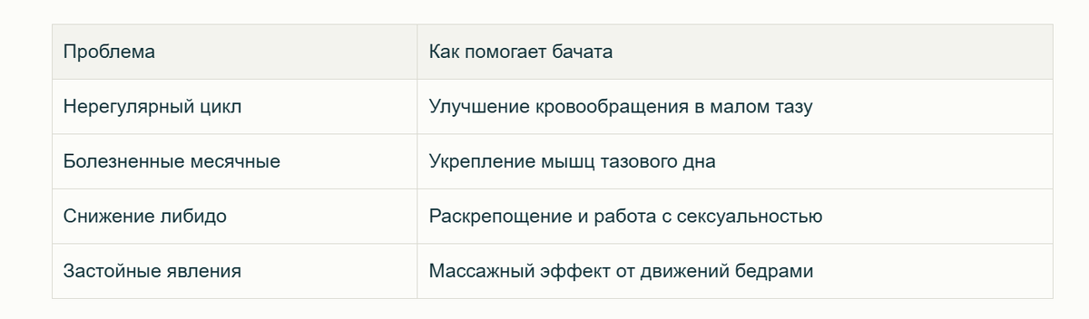 Бачата — единственный танец, который специально воздействует на женскую репродуктивную систему. Движения бедрами улучшают кровообращение в органах малого таза, что положительно влияет на женское здоровье.
