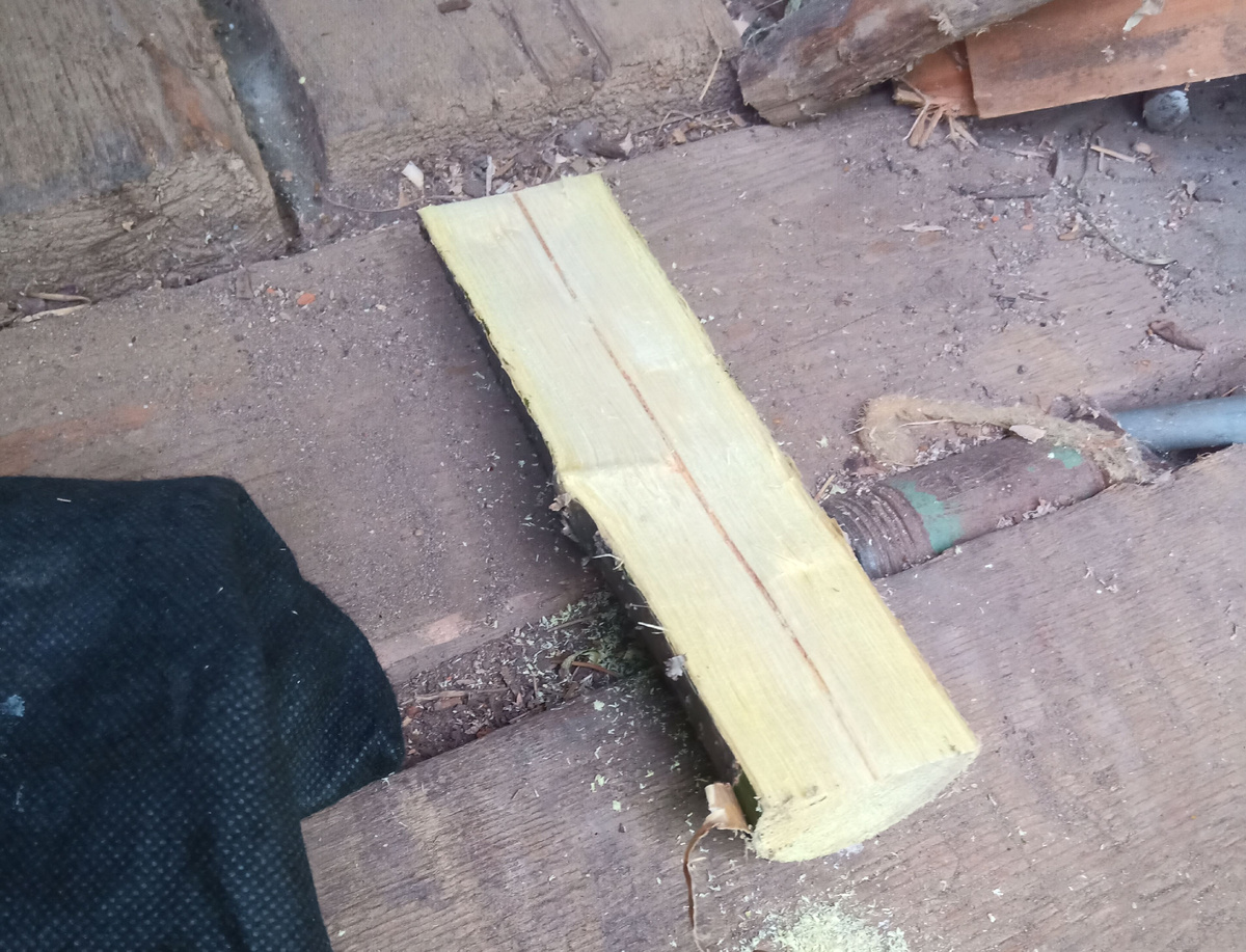 Текст целиком и полностью написан исключительно автором данного блога. Все изделия, приведённые рисунки и фотографии выполнены автором. Пост не содержит никакой запрещенной, или ограниченного пользования, информации. Пост касается исключительно описания процесса работы с деревом и изготовления из него различных полезных предметов. Данный пост является изложением исключительно собственного мнения и опыта работы, не является услугами по просветительской деятельности и не подлежит лицензированию в соответствии с Федеральным законом «Об образовании». Читаем медленно и вдумчиво, не забываем дочитывать текст до конца! Будьте здоровы и хорошего всем настроения! Продолжаю работать с древесиной караганы (желтая акация). Беру вторую половинку поленца от ранее расколотого кусочка. Так как диаметр стволика относительно маленький, то ложка снова сориентирую лицевой стороной к центральной части. Выполняю надпил и скалываю плоскость под черпало. Стёсываю плоскость с другой стороны от надпила и рисую