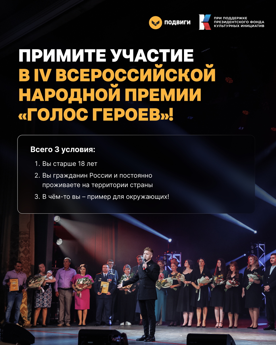 Мы рады объявить о старте номинирования на IV Всероссийскую Народную премию «Голос героев»! 💫 В этом году мы ждём заявки из всех регионов России! Не откладывайте: переходите на официальный сайт премии 👉 https://award2025.kartageroev.ru/ и номинируйте человека, которому хотите сказать спасибо – за его добрый поступок, профессионализм и любовь к своему делу. Пусть о вашем герое услышит вся страна!✨