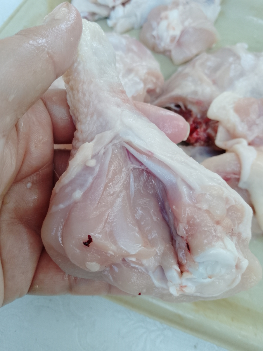 И сызнова и вновь простой, быстрый и вкусный рецепт приготовления пищи на мангале. У меня была курица весом, примерно,1,8 кг. Грудка пошла на рубленные котлеты ( рецепт оставлю в конце статьи), а остальные части, включая спинку и остов от грудки пошли в шашлык. И да, я не стесняюсь использовать в приготовлении шашлыка, те части, которые обычно называются суповым набором. На них такое же мясо как и на других частях курицы, не вижу смысла их выкидывать или забивать ими морозилку, как готовится "до лучших времен". Перейдем к подготовки курицы: Крылья разрезаю на части по суставу, получается 4 кусочка. (Лучевую часть крыла я выкидываю) 2 ножки, 2 бедрышка, остов от куриной грудки и спинка, с которой я снимаю кожу, удаляю попу и режу на две части. Что бы все точно пропеклось и приготовились равномерно, толстые куски с костями я надоедаю оголяя кость. Так я делаю с ножками И бедрышками. Далее овощи и грибы, их количество зависит от Вашего желания. Я добавила несколько помидоров, нарезан