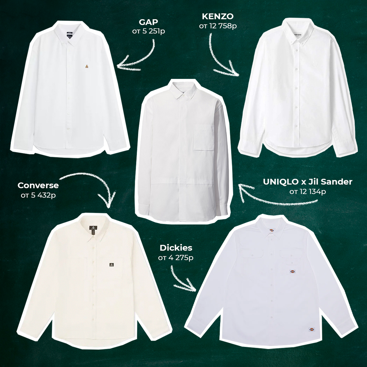 Остался месяц до начала учебы. Тревогу и апатию выключаем, ведь это отличный повод прикупить себе новые вещи. Например, белую рубашку из нашей подборки — для 1 сентября вообще годнота. Converse, цена от 5 432₽* GAP, цена от 5 251₽* UNIQLO x Jil Sander, цена от 12 134₽* KENZO, цена от 12 758₽* Dickies, цена от 4 275₽* *стоимость может изменяться в зависимости от курса и размера Больше интересного на нашем сайте POIZON