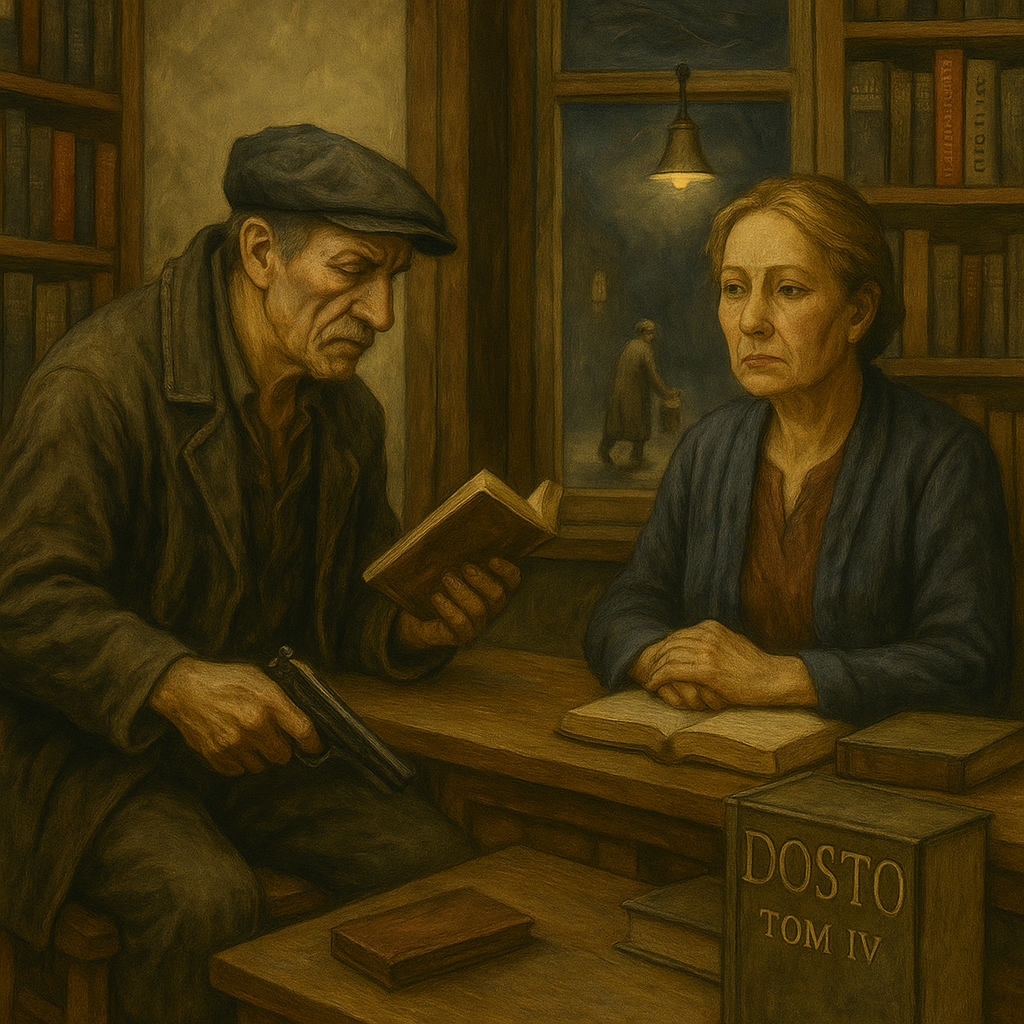 Посвящается Исааку Бабелю В провинциальном городе N, где табачный дым цепляется к подоконникам, а куры клюют булыжники возле ветхого рынка, жил да был человек по фамилии Каплун. Бывший сварщик, полу-грузин, полу-портняжка, с лицом, как у отставного чёрта, и походкой уличного танцора. Он носил старый плащ с выцветшими пуговицами и смотрел на мир как на жертву. Вечером, когда электрички уже не ходят, а старухи сортируют по пакетам боль и счастье прожитых лет, Каплун вошёл в книжный магазин. Он вошёл так, как входят в церковь - не от веры, а от нужды. На двери висел колокольчик, который звенел, как больная канарейка. В магазине пахло мышами, дождём и бумажной тоской. За прилавком сидела женщина - с косой, как у пионерки, и глазами, как у учительницы начальных классов, у которой умер муж, но не умерла страсть к мечтам. Она читала Чехова. Каплун, держась за карман плаща, где дремал ржавый пистолет ТТ, сказал глухо, по-бандитски: - Кассу давай.