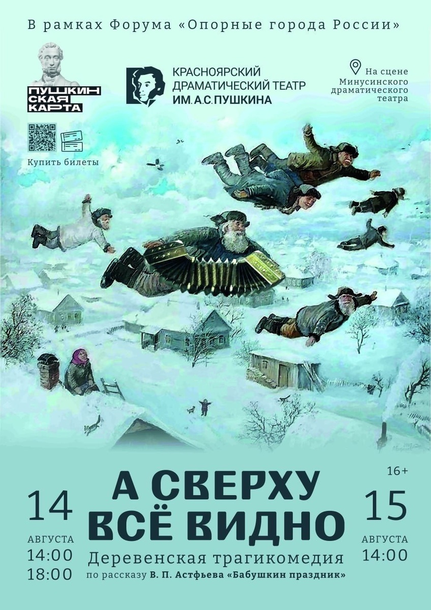 В рамках ІІ Форума «Опорные города России» на исторической сцене Минусинского драматического театра состоятся гастроли Красноярского драматического театра имени А.С.Пушкина. Будет представлена деревенская традикомедия «А СВЕРХУ ВСЕ ВИДНО» по рассказу В.П.Астафьева «Бабушкин праздник». Раздвинутся меха гармони, наберут воздух в свои музыкальные легкие, и задышит деревня светлой грустью доброй памяти. Было время, когда в праздники за одним столом собирались огромной дружной семьей родственники и друзья. Ведь когда все вместе, и беда – не беда, горе – не горе, а всё, что ни происходит – лишь жизнь, делимая на всех поровну. Именно об этом времени, об этих людях – эта история: смешная и грустная, как сама жизнь. Показы: 14 августа в 14.00 и 18.00; 15 августа в 14.00. Возрастное ограничение 16+ Спектакль – участник программы «Пушкинская карта».