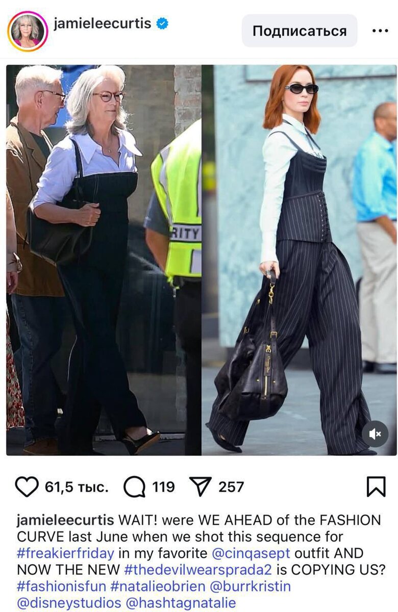 Джейми Ли Кертис устраивает модный приговор, сравнивая свой образ из «Чумовой пятницы 2» с Готье на Эмили Блант из «Дьявол носит Prada 2». Скрин из запрещенной экстремистской социальной сети.