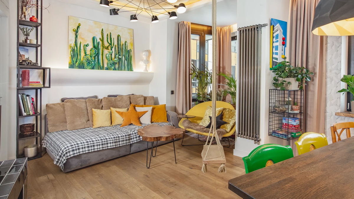 Так в интерьере появился яркий зелёный, щедро дополненный сочным жёлтым, — сочетание, которое буквально заливает пространство светом и жизнью. А в центре гостиной поселились качели. Да-да, самые настоящие, на толстых верёвках, прикреплённых к потолку. Кто-то скажет, что это детская забава, но мои качели — вполне взрослые. Делала я их в первую очередь для себя, и это было совсем несложно. Понадобились доска, крепкие верёвки и немного фантазии. При этом выглядят они как настоящая дизайнерская находка во многом благодаря дереву, из которого сделаны. Это не просто состаренная доска, а подлинный старинный материал с историей. Я взяла его у ребят, которые первыми начали разбирать древние дома, реставрируя элементы с характером.