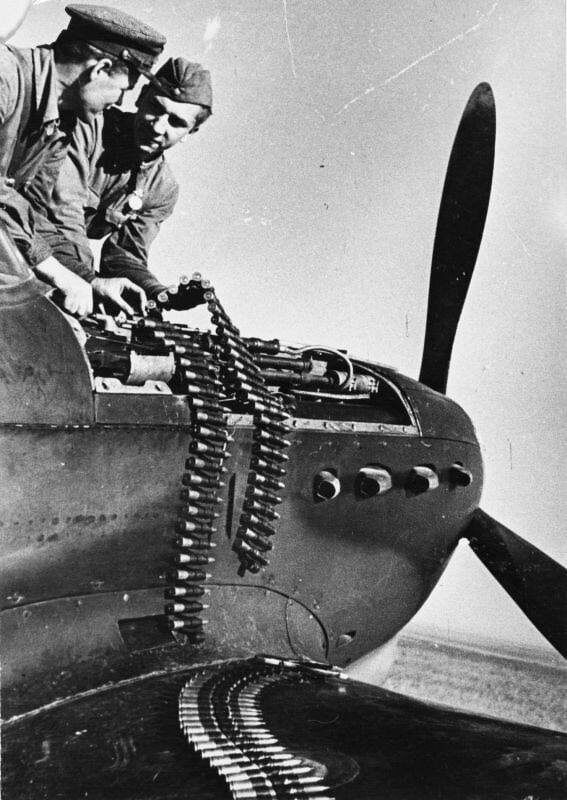 Советские оружейники заряжают 12,7-мм пулеметы УБС истребителя Як-7Б. На пределе🔥