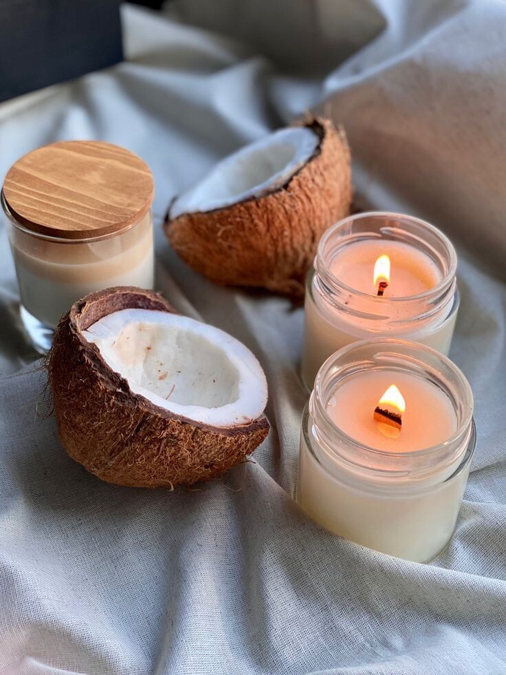 - Кокосовый: Отличная аромаотдача, гладкая поверхность, медленное горение. Часто смешивается с соевым (кокосо-соевая смесь). Температура заливки: ~45-55°C.
