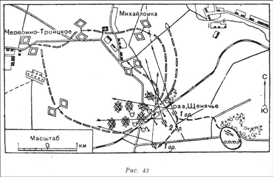 В 15.00 22 июня 1942 г. из хут. Червонно-Троицкое показалось около 100 танков противника, направлявшихся колонной на с. Михайловка. Пройдя около 500 м, несколько десятков танков круто повернули на юг и, пройдя в южном направлении 2 км, опять изменили направление на восток, остальные продолжали двигаться на с. Михайловка и далее на разъезд Щенячье, приближаясь к нему с севера.