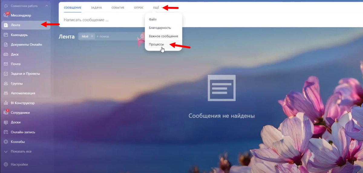 Наш телеграмм канал: https://T.me/TopalovGroup_official ▌Запуск процесса Согласования Запуск процесса согласования в Битрикс24 осуществляется непосредственно из ленты новостей. Для этого необходимо выполнить следующие шаги: 1. В ленте новостей найдите вкладку с названием "Еще". 2. В открывшемся меню выберите пункт "Процессы". 3. Из предложенного списка выберите бизнес-процесс, который вы хотите запустить. Битрикс24 поддерживает различные типы процессов согласования, охватывающие широк