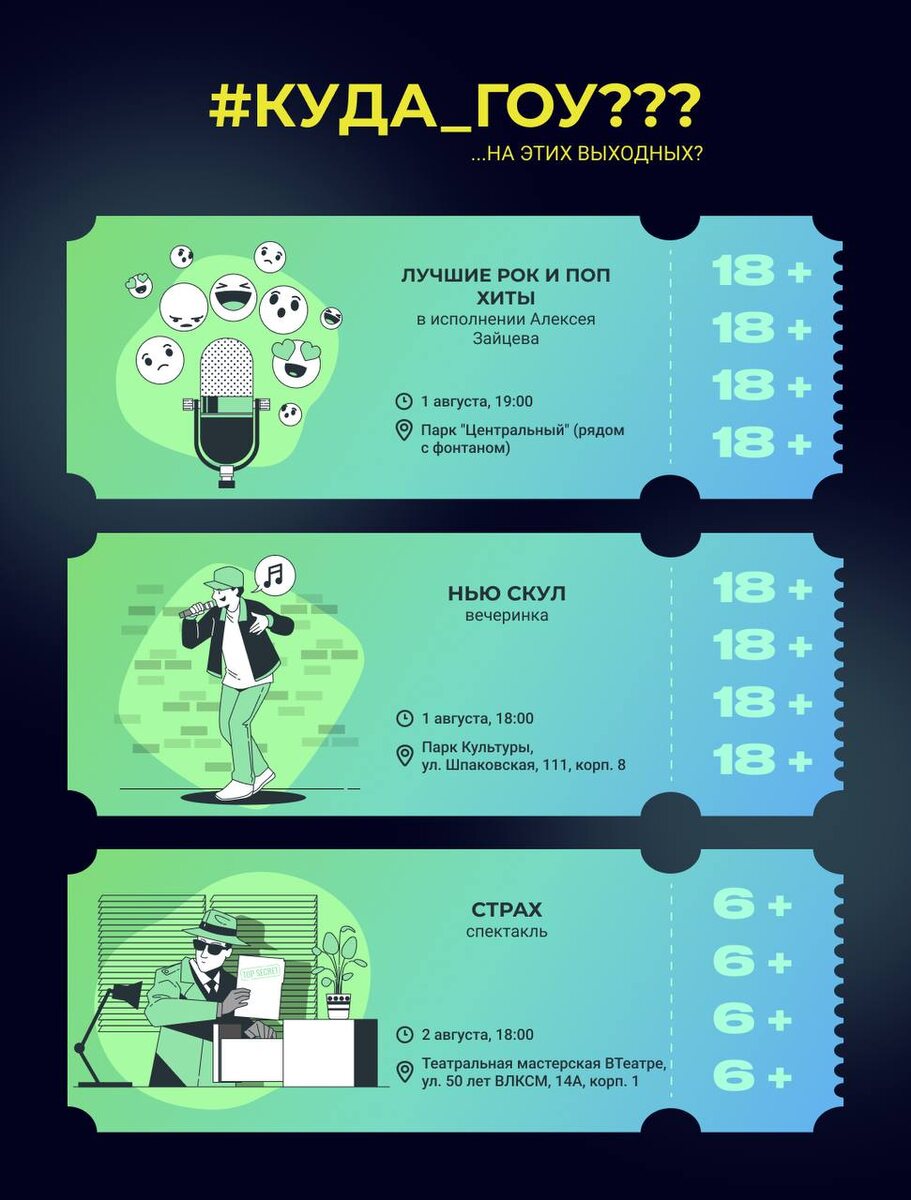 Неохота выходить из дома в такую жару? Чтобы не потратить время зря, в нашей подборке мы расскажем о самых интересных мероприятиях #Куда_гоу этих выходных! 🔹Лучшие рок и поп хиты 1 августа в 19:00 в Кстати Клаб-парк будут звучать лучшие рок и поп хиты в исполнении Алексея Зайцева. Тебя ждёт громкая и яркая музыка, которая поможет зарядиться энергией на все выходные! Место проведения: Парк "Центральный" (рядом с фонтаном). 18+ 🔹Нью скул 1 августа в 18:00 пройдёт вечеринка на открытом воздухе. свежий звук, узнаваемые лица и биты, которые не нуждаются в подводке. Приходи и становись частью вечера, который не хочется прерывать. Приходи по адресу: ул. Шпаковская, 111, корп. 8. 18+ 🔹Страх Что пугает подростков? 2 августа ВТеатре спектакль позволит взглянуть на мир глазами самих подростков и погрузиться в атмосферу их переживаний. Начало в 18:00, по адресу: ул. 50 лет ВЛКСМ, 14А, корп. 1. 6+ 🔹Nightwish Tribute Show 2 августа в 20:00 пройдёт трибьют-шоу — шоу, в котором песни известных