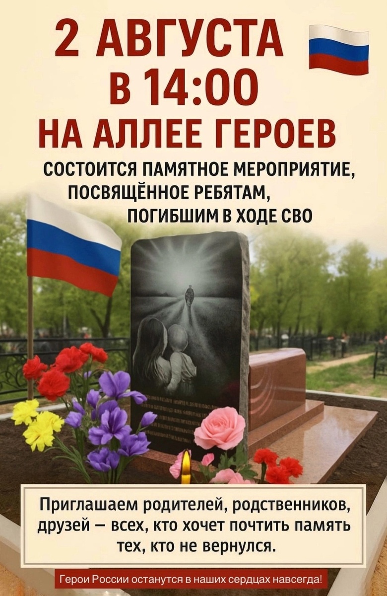 🗓️ 2 августа | Начало в 14:00 | 📍Аллея Героев (Старое кладбище) Состоится памятное мероприятие, посвящённое ребятам, отдавшим свою жизнь в ходе СВО. ☝🏼Приглашаем родителей, родственников, друзей и всех, кому дорога память о защитниках России. 🕯 Будет отслужена панихида — в тишине и молитве мы вспомним каждого, кто с честью исполнил свой долг перед Родиной. ⭐️🇷🇺Герои России останутся в наших сердцах навсегда!
