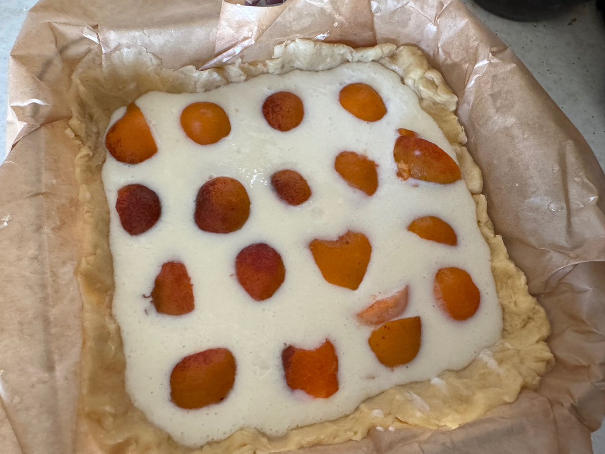 Для начала испекла песочный пирог с абрикосами в сметанной заливке к чаю. Попробовала новый рецепт. Получился очень вкусный и нежный пирог, причем, как мне кажется, можно использовать не только абрикосы-персики, но и ягоды, например.
