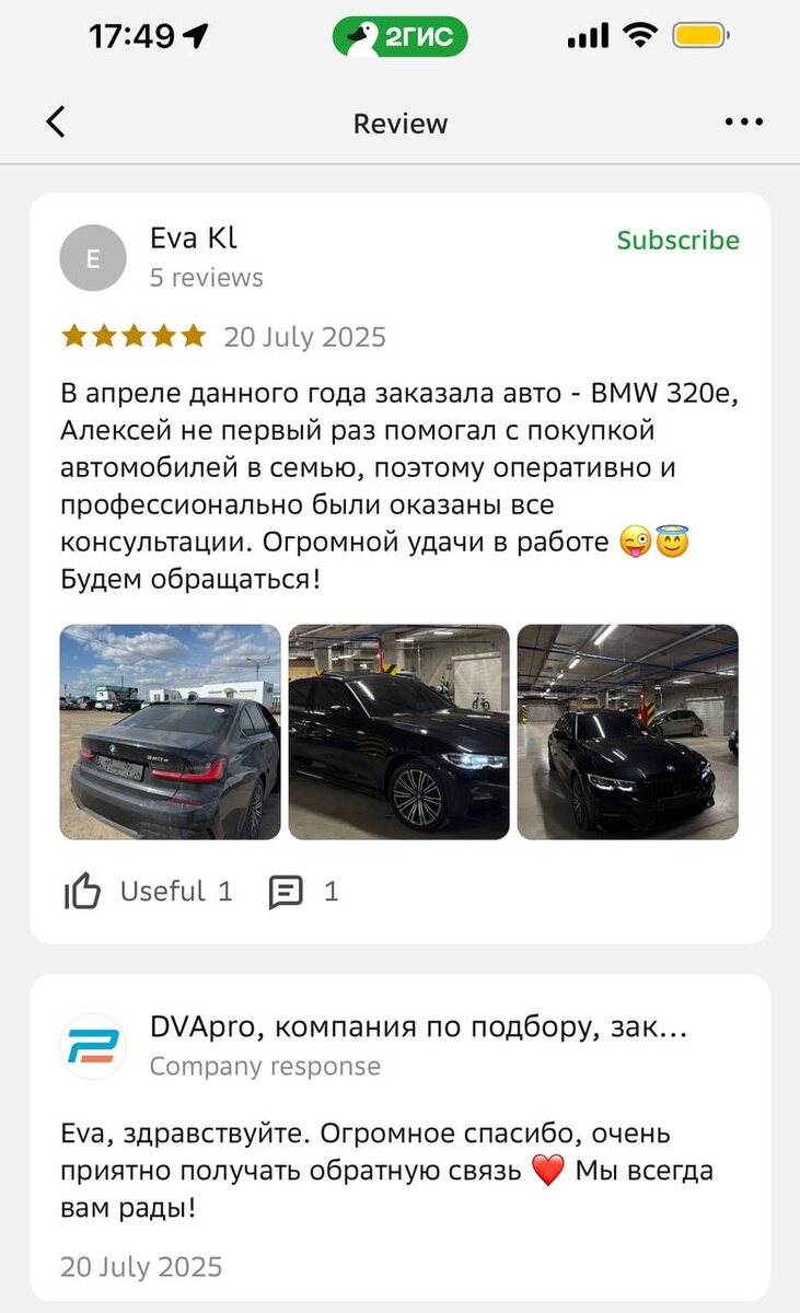 BMW 320e — уже не первый автомобиль для вашей семьи, и это для нас лучшая награда 🙌 Мы правда ценим, что вы снова выбрали нас. Значит, делаем всё правильно. Красива, аккуратная, на отлично подготовленная — пусть радует вас каждый день! Хочешь такой? Пиши нам в телеграм — расскажем всё, оформим и доставим.