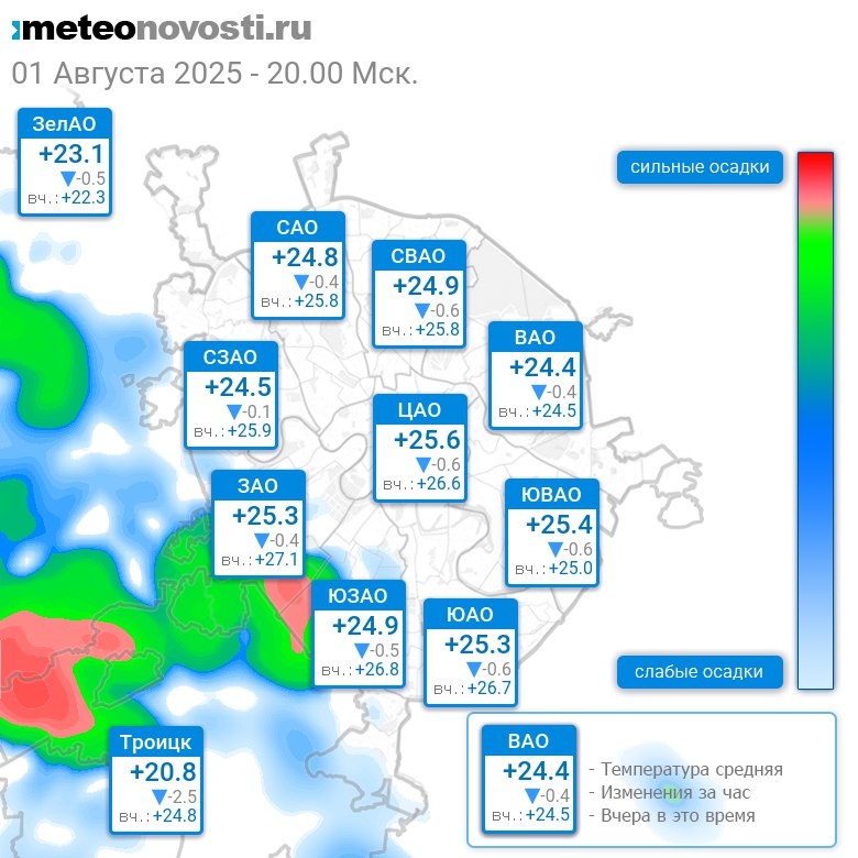 В 20:00 в Москве было от +21.9°C до +25.9°C, средняя температура +24.8°C #погода #Москва #лето #температура #1августа #пятница