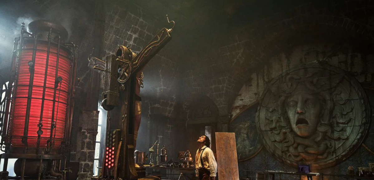 Для украшения помещения использовали камень, серебро, металл, а над локацией соорудили высокие шпили, попадание молнии в которые, по сюжету, и привело к оживлению Франкенштейна.