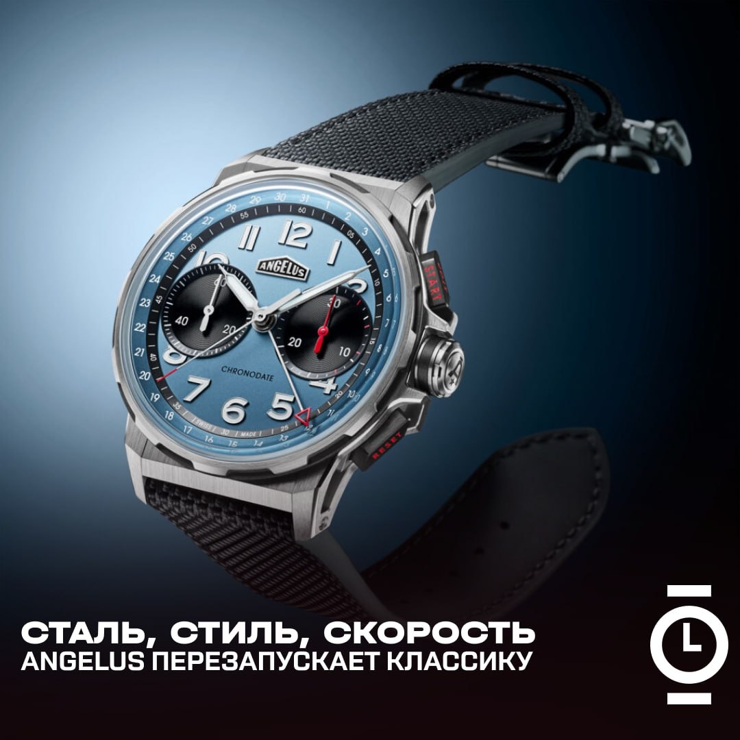 СТАЛЬ, СТИЛЬ, СКОРОСТЬ: ANGELUS ПЕРЕЗАПУСКАЕТ КЛАССИКУ #обзор_WD В 2023 компания Angelus представила свежую версию своего спортивного хронографа Chronodate в цвете Storm Blue. Эта модель объединяет классические черты и современные материалы, находясь на грани между винтажной эстетикой и технологичным дизайном марки. Корпус диаметром 42,5 мм и толщиной 14,25 мм изготовлен из титана и обладает современными угловатыми формами. Средняя часть корпуса, безель, заводная головка и задняя крышка выполнены из титана, в то время как внутренняя часть корпуса, кольцо безеля и кнопки хронографа — из лёгкого углеродного композита. Циферблат и задняя крышка защищены коробчатыми сапфировыми стёклами. Водонепроницаемость — 30 метров. Главное отличие этой версии — ледяной сине-голубой циферблат Storm Blue с двумя чёрными счетчиками с концентрической гравировкой и красными акцентами. Стрелка указателя даты в форме стрелы указывает текущий день месяца по шкале по краю циферблата. Часы оснащены автомат