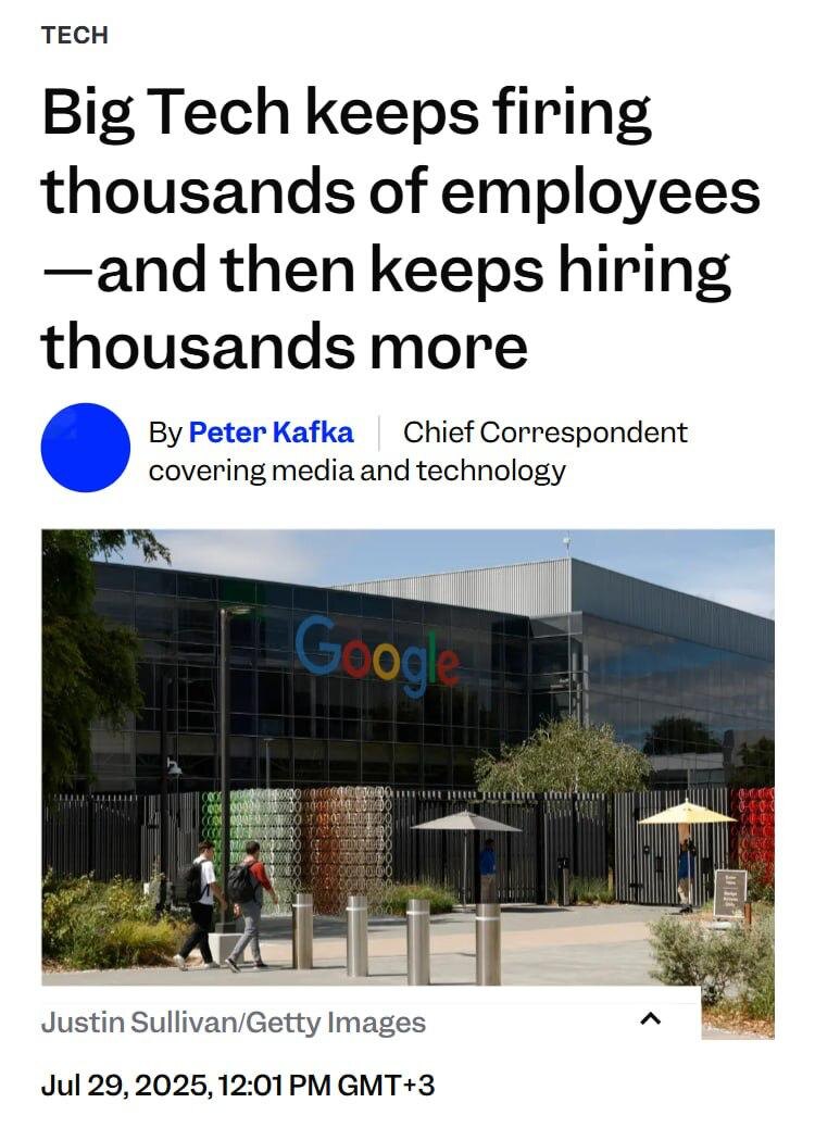 Мы уже писали о кадровых решениях в бигтехе, но последнее время — за кадрами началась увлекательнейшая гонка. Сначала массово раздают сотрудникам конвертики с прощаниями, а потом — с тем же энтузиазмом — нанимают новых, только уже с зарплатами, которые не снятся простым смертным. Парадокс 2025 года в полный рост: Microsoft, Google, Meta* бодро сокращают тысячи людей, а через пару месяцев внезапно открывают примерно столько же вакансий — но уже не для «просто айтишников», а для элитных спецов по ИИ и облакам. По сути, это перетасовка колоды: закрываем скучные и не слишком прибыльные проекты, чтобы сделать ставку на корову, которую еще доить и доить — искусственный интеллект. И ради этого готовы платить. Один только Цукерберг, говорят, недавно махал чеком на 100 миллионов долларов, лишь бы заполучить топ-инженеров из OpenAI. Самое забавное: те, кто сейчас получает астрономические суммы, создают нейросети, которые лет через пять — максимум десять — заменят их же собственными алгоритма
