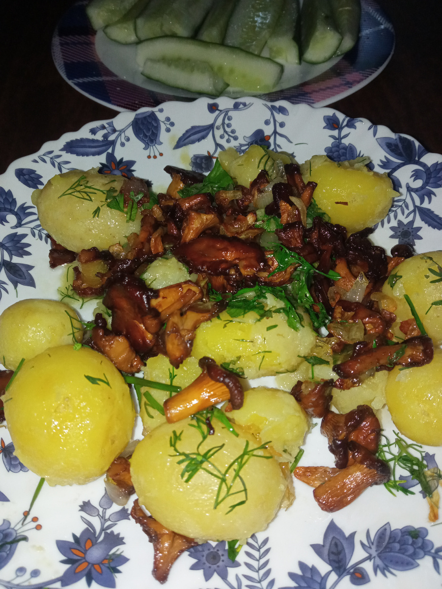 Иногда хочется такого, вот не знаешь какого и чего. И тут приходит на помощь матушка природа и конечно же качество юного натуралиста. Желание сбегать в лес ради прогулки и как бонус найти грибочков. И вот они - лисички, это же деликатес! А если ещё и картошечка в огороде подросла и можно копнуть на жарёшку, то вуа-ля наивкуснейший ужин обеспечен. Засучаем рукава и погнали кулинарничать. Я помыла картошку, чуть поскрябала её и отварила в подсоленной воде. Хотя можно было и с кожурой отварить, она сейчас тонюсенькая и в ней все витамины. Добавила сливочного масла и немного нашинкованного укропчика. Грибы почистила, хорошенько промыла и отправила на сковородку. Они дали сок и варились в нём с добавлением соли под закрытой крышкой. Готовились так минут десять, затем без крышки до полного исчезновения влаги. Затем добавила подсолнечного масла и репчатого лука, порезанного тонко полукольцами. Всё это жарилось до золотистого цвета, это важно, вкус получается волшебный! Сдобрила сливочным ма
