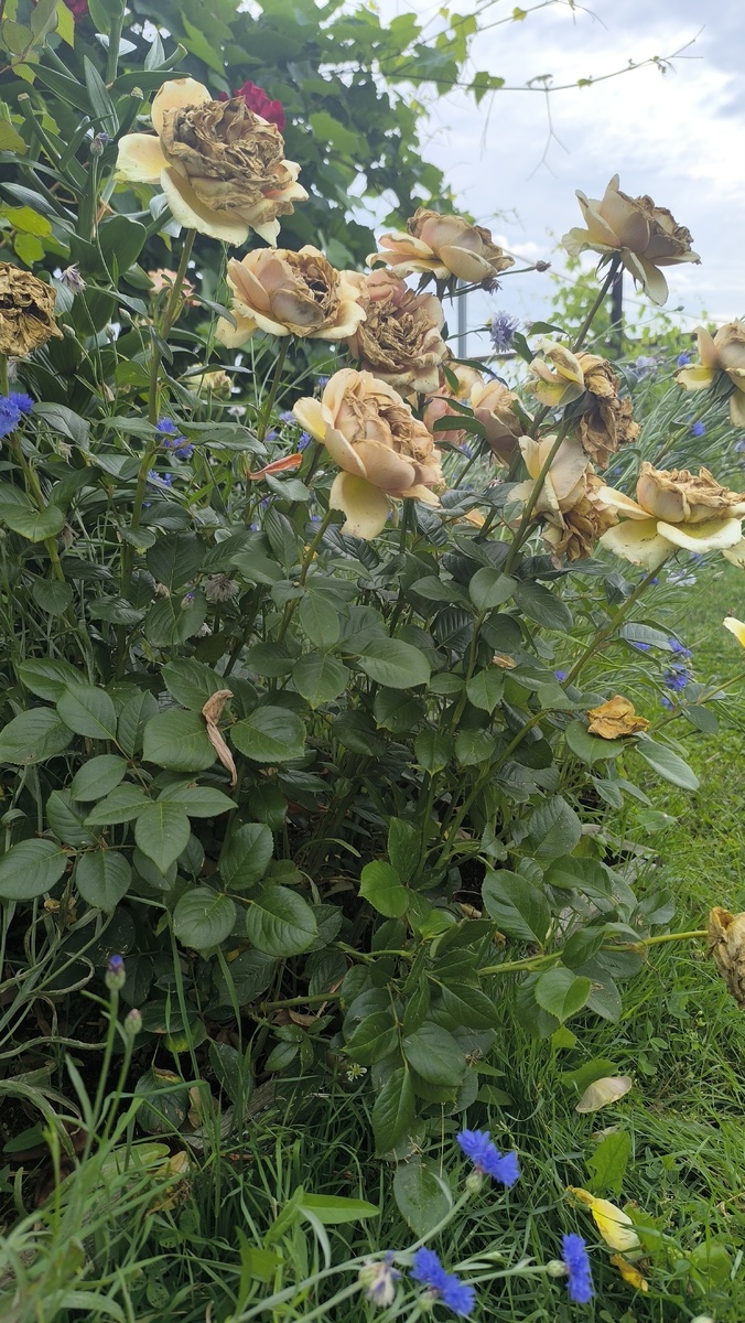 Не очень давно у меня закончился период летней обрезки роз после первого цветения. Делаю я это очень безжалостно очищая все что на мой взгляд уже не принесет пользы растению. Вот на примере своего огненного чайно- гибридного куста Ashram. По фото ниже правда не скажешь что роза красивая но уж что есть на то и обрезать пора было. Куст довольно активный сам по себе, цветов в первую волну всегда много и очень дружно, начинаю с обрезки высоты всех отцветшие побегов. Обрезаю почти на половину в высоту, так как мне здесь не нужен не сильно высокий куст. Если резать выше плюс новый прирос будет слишком большой куст. После обрезки вот так стало. Дальше я ныряю внутрь куста и удаляю мелкие слепые и тощие побеги, прорежая внутреннюю часть куста. И оставляя хороший крепкий скелет. Заодно и старые нижние листы частично удаляю чтобы лучше проветривалось. Было до обрезки. После стало Розовым отметила то что тоже удалила в итоге. В итоге вот такой прозрачный и лёгкий куст получился. В таком клю