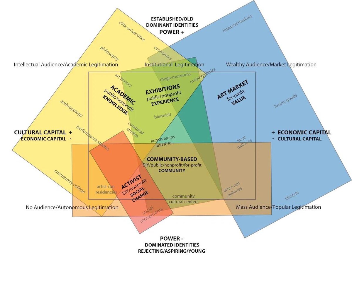 Давайте же пристальнее всмотримся в эту карту художественных вселенных, эту остроумную адаптацию бурдьёвских размышлений, созданную рукой современной художницы: