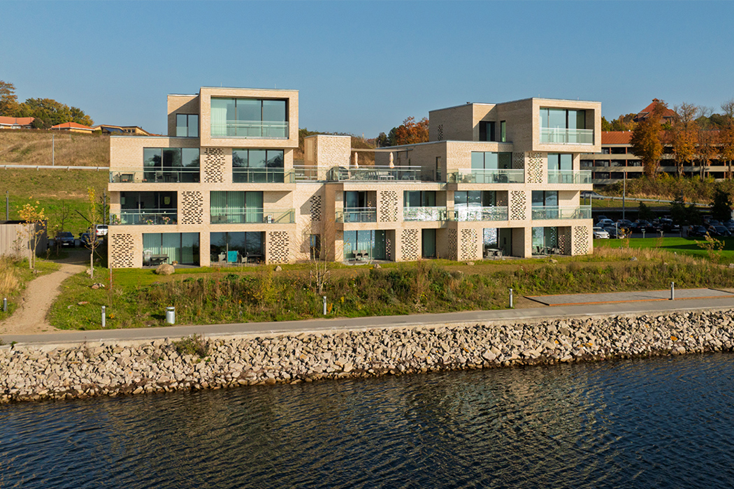 Многоквартирный дом Danfoss House совмещает функции центра тестирования и жилья для сотрудников. Компания Danfoss завершила строительство Danfoss House в городе Сённерборг, Дания — многоквартирного жилого здания, которое одновременно служит испытательным полигоном для устойчивых строительных технологий. Этот проект стал первым в мире жилым зданием из кирпича и бетона, получившим платиновый сертификат DGNB — высшую оценку Немецкого совета по экологическому строительству. Danfoss House спроектирован как демонстрация декарбонизации многоквартирного жилья. В нём реализованы различные энергосберегающие решения Danfoss: централизованные и децентрализованные системы отопления для сравнительного анализа, напольное охлаждение, диффузная вентиляция с охлаждением, а также «умный дом» с активным контролем температуры. Десять геотермальных скважин глубиной 100 м (328 футов) обеспечивают круглогодичное отопление и охлаждение на основе грунтовых вод. «Danfoss House будет использоваться для демонстрац
