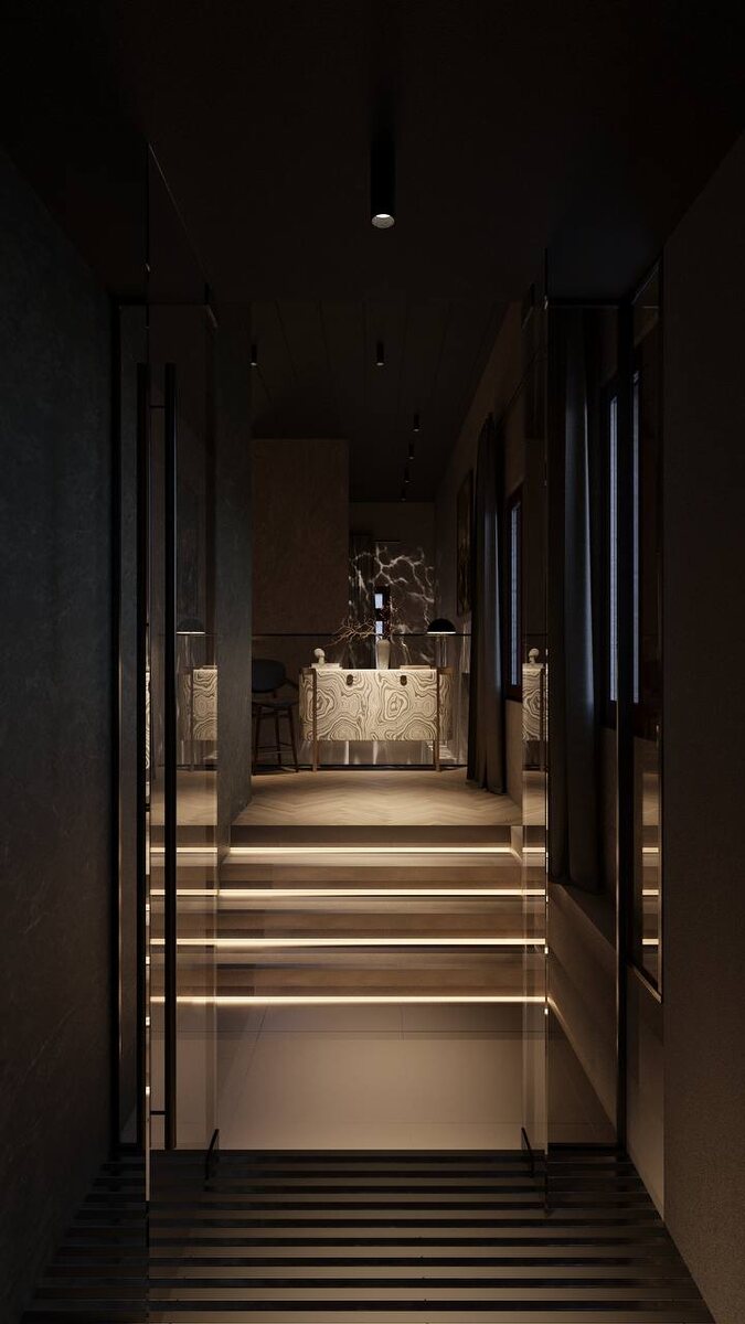 Guest Wine House — мистицизм в самом центре Тюмени Мы работали с по-настоящему уникальным зданием, расположенным на одной из главных улиц города. Когда-то здесь торговали тканями — и мы бережно встроили этот пласт истории в интерьер: сложные текстуры, тактильные обои "под ткань", акцент на материалах. Но самое главное — в этом пространстве мы не просто разработали интерьер, а создали многослойный культурный опыт. На минус первом этаже расположена тайная комната Григория Распутина. Не мистицизм ради мистицизма, а настоящее гастрономическое шоу с подачей блюд и проекциями, посвящённое противоречивой и притягательной фигуре Распутина. Чтобы попасть туда, гость проходит по тёмному коридору через кухню, следуя по световому мэппингу с цитатами и фразами. Пространство ведёт к столу с центральной подачей, приватным лаунж-зонам и стеклянным вставкам в полу с видом на кладку XVII века, найденную при реконструкции. Это место для диалогов о прошлом и настоящем. На первом этаже — ресторан. Сердц