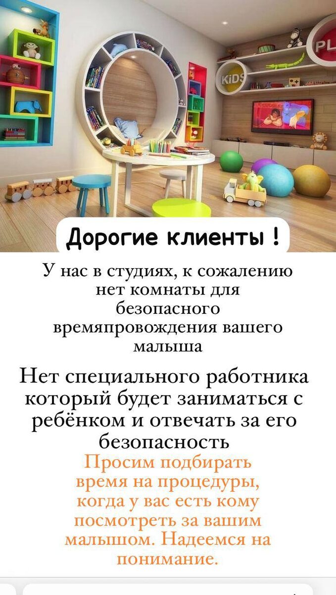 Дорогие клиенты 🫶 В нашем помещении используются острые инструменты, химические вещества, горячие приборы — присутствие детей может быть опасно для них. У нас, к сожалению нет специальной комнаты для комфортного времяпровождения детей и специального работника который будет отвечать за их безопасность. Просим вас подбирать время на процедуры когда у вас есть с кем оставить вашего малыша . Спасибо за понимание 🫶
