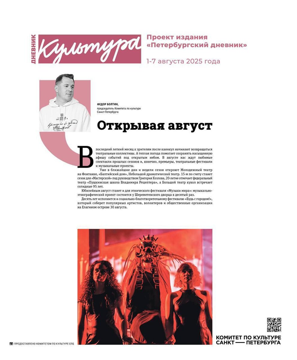 📰 А вы уже прочитали Культурную вкладку «Петербургского дневника»? Председатель Комитета по культуре Санкт-Петербурга Федор Болтин — о главных событиях последнего месяца лета. Подробности — в пятничном выпуске нашей газеты. Петербургский дневник