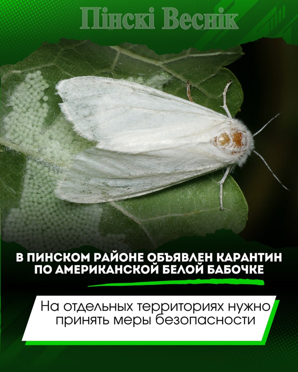 🤍🤍🤍 🤍Пинская районная государственная инспекция по семеноводству, карантину и защите растений сообщает, что решением Пинского райисполкома от 24.07.2025 № 1003 в деревнях Добрая Воля Оснежицкого сельсовета, Кнубово Плещицкого сельсовета, Пинковичи Пинковичского сельсовета в границах населенных пунктов объявлен карантин по американской белой бабочке. Руководителям организаций, индивидуальным предпринимателям и физическим лицам, находящимся в границах карантинной фитосанитарной зоны необходимо проверить свои земельные участки и территорию, примыкающую к ним, на предмет наличия американской белой бабочки и принять меры по борьбе с вредителем. 📍📍@Пинский Вестник ЮТУБ | САЙТ| ИНСТ | ВК | ОК | ФЕ | Прислать новость