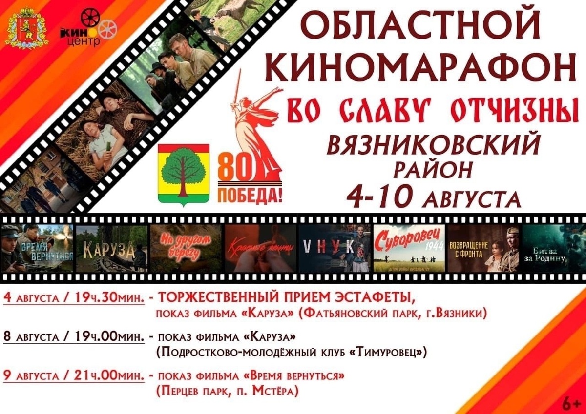 В Вязниковском районе стартует киномарафон «Во славу Отчизны» Вязниковский район примет эстафету областного киномарафона. Открытие состоится 4 августа в 19:30 в Фатьяновском парке города Вязники, где пройдёт показ фильма «Каруза». В Вязниковском районе стартует киномарафон «Во славу Отчизны» В Вязниковском районе стартует киномарафон «Во славу Отчизны» С 4 по 10 августа Вязниковский район примет эстафету областного киномарафона. Открытие состоится 4 августа в 19:30 в Фатьяновском парке города Вязники, где пройдёт показ фильма «Каруза». Также, в рамках киномарафона зрителей ждут интересные кинопоказы 8 августа в 19:00 в подростково-молодёжном клубе «Тимуровец», где состоится повторная демонстрация фильма «Каруза», и 9 августа в 21:00 в Перцевом парке посёлка Мстёра, где можно будет увидеть кинокартину «Время вернуться». Организаторы приглашают жителей и гостей района провести летние вечера за просмотром патриотического кино.