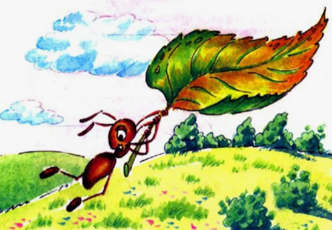 Залез Муравей на березу до самой макушки, а оттуда его муравейник чуть виден. Муравьишка сел на листок, чтобы отдохнуть перед спуском вниз, и видит, что все домой бегут. А все по тому, что дисциплина у муравьев строгая: как только солнце сядет, так все ходы будут закрыты, и ночевать придется на улице. А солнце уже начало спускаться, но муравей сидит на листке и думает, что успеет вернуться. А листок был сухой, поэтому от дуновения ветерка он сорвался с ветки и понесся через лес, реку, деревню. А Муравьишка на листке качается и боится. Опустился листок на луг за деревней, да еще и на камень. Муравьишка себе ноги отшиб. Вот он лежал и думал о том, что не сможет добраться до дому. И вдруг видит Муравей, что рядом Гусеница-Землемер лежит. Попросил Муравьишка Землемера отнести его домой, а то ножки у него болят. Тот согласился. Муравьишка вскарабкался на спинку к Землемеру, а тот изогнулся, потом встал во весь рост и лег палкой на землю. Так и стал он передвигаться, меряя землю. И получа