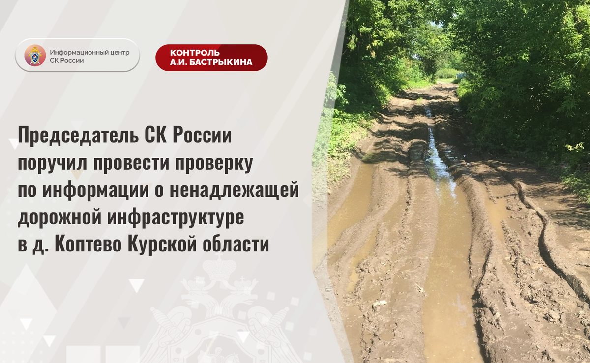 Председатель СК России поручил провести проверку по информации о ненадлежащей дорожной инфраструктуре в д. Коптево Курской области В социальной сети размещено обращение по вопросу нарушения прав жителей деревни Коптево Курской области на качественную дорожную инфраструктуру. Длительное время подъездная дорога находится в непригодном состоянии: асфальтное покрытие отсутствует, на поверхности образовались многочисленные ямы и колеи, грунтовое полотно при выпадении осадков размывается. В связи с этим проезд автомобилей и транспортных средств экстренных служб к домовладениям затруднен. Обращения граждан в различные инстанции результатов не принесли. Председатель Следственного комитета Российской Федерации Александр Иванович Бастрыкин поручил руководителю СУ СК России по Курской области Андрею Борисовичу Гусеву провести процессуальную проверку и доложить о ее ходе и результатах. Исполнение поручения, а также ход процессуальной проверки поставлены на контроль в центральном аппарате ведомств