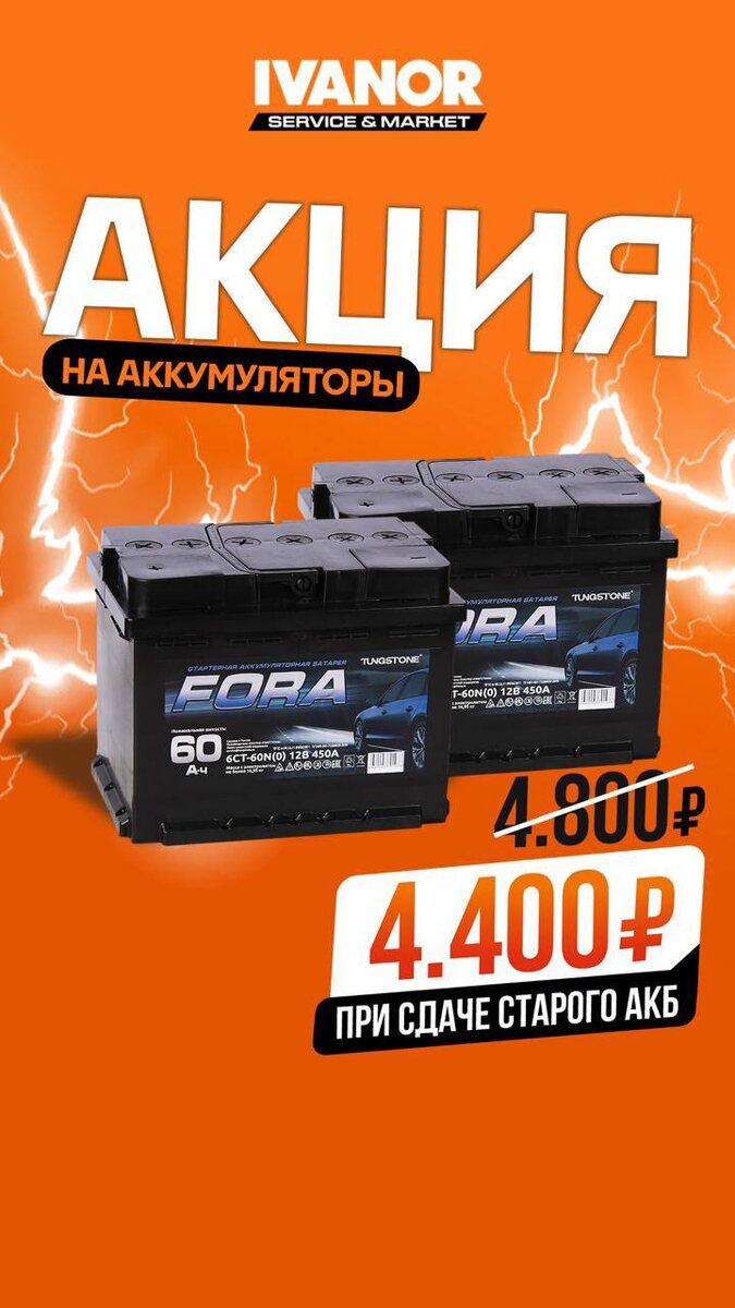 В IVANOR стартует акция на АКБ - Аккумулятор FORA 60 А/ч L, и Аккумулятор FORA 60 А/ч R 🔥При сдаче старого аккумулятора, на новый цена 4400₽, вместо 4800₽
