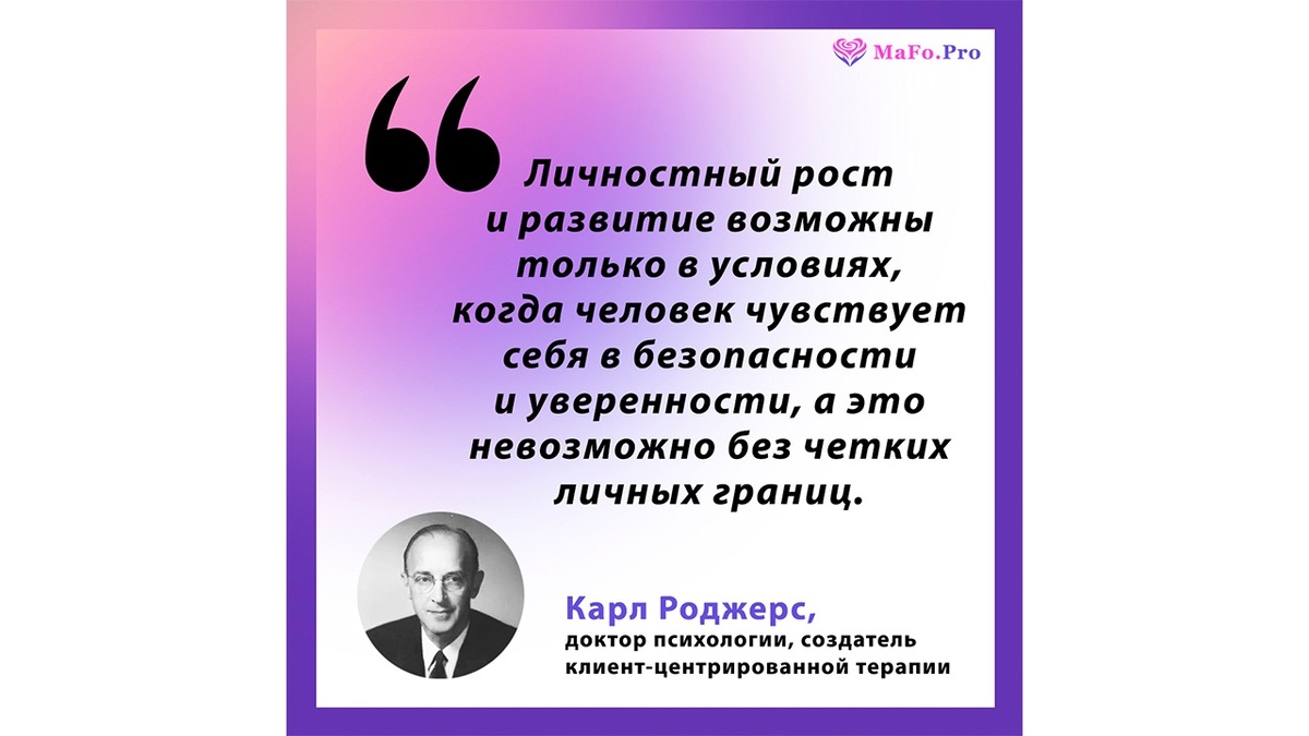 Карл Роджерс (1902–1987), выдающийся психолог XX века, один из основателей гуманистической психологии, утверждал, что личностный рост возможен только в условиях безопасности и уверенности ✨, которые, в свою очередь, невозможны без четких личных границ 🛡️. Это ключевая идея, которая объясняет, почему многие из нас не могут достичь своих целей и жить той жизнью, о которой мечтают. 😔 Неспособность сказать «нет» 🚫, согласие на то, что Вам не нравится 😫, и позволение другим игнорировать Ваши потребности — все это указывает на отсутствие личных границ. Часто причина кроется в детских психотравмах. Если в детстве границы ребенка постоянно нарушались (например, через психологическое насилие, обесценивание, пренебрежение, телесные наказания, сексуальное использование), он не научился их выстраивать. 🧠 Мозг человека усваивает, что его потребности неважны, а чужие — в приоритете. 😟 Такой детский опыт создает порочный круг 🔄: ✅ психотравма из детства, ✅ отсутствие личных границ, ✅ неспособн