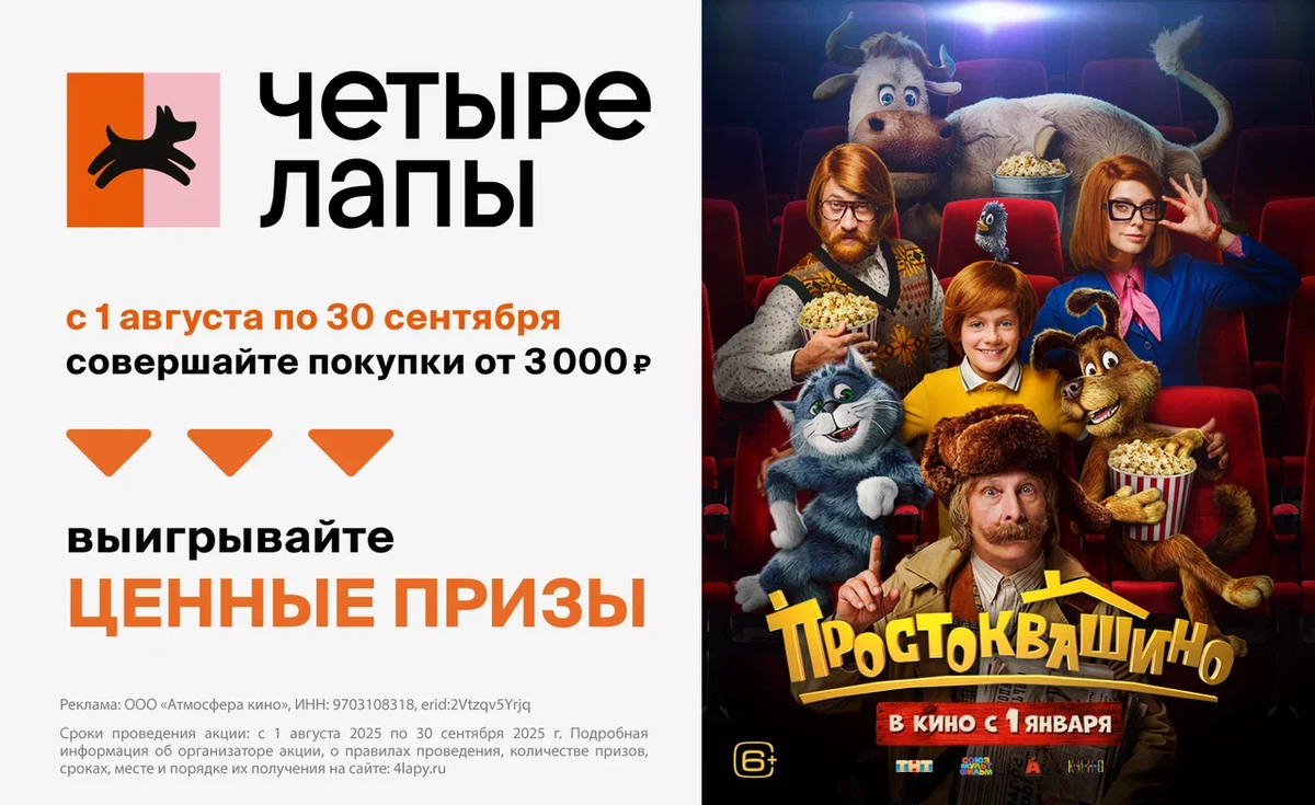 Совершайте покупку и выигрывайте ценные призы! 🎁 Жарким летом мы иногда думаем о том, как здорово будет окунуться в сказочную зиму! ❄️ Давайте ждать зиму вместе? ☃️ 1 января состоится долгожданная зимняя премьера – в кинотеатрах выйдет фильм «Простоквашино» (6+)! Совместно с кинопрокатной компанией «Атмосфера кино» запускаем акцию, в которой можно выиграть пригласительные билеты на закрытую премьеру в Москве, а наши покупатели из регионов получат шанс выиграть эксклюзивную поездку в столицу на премьеру фильма «Простоквашино»! 🎥 🔗Подробности здесь: 4lapy.ru/journal/info/film-prostokvashino-6-darit-cennye-prizy Сроки проведения акции с 1 августа 2025 г. по 30 сентября 2025 г. Подробная информация об организаторе акции, о правилах проведения, количестве призов, сроках, месте и порядке их получения на сайте: 4lapy.ru (http://4lapy.ru/) Реклама. ООО «Атмосфера кино», ИНН 9703108318, Erid:2Vtzqv5Yrjq